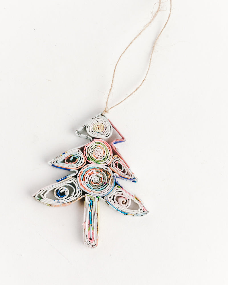 This Christmas season, get into the holiday spirit with this cheerful Christmas tree ornament from our recycled paper home décor collection. Handmade in Vietnam from leftover magazine pages, it's a thoughtful way to show your appreciation for the environment while bringing cheer and joy.